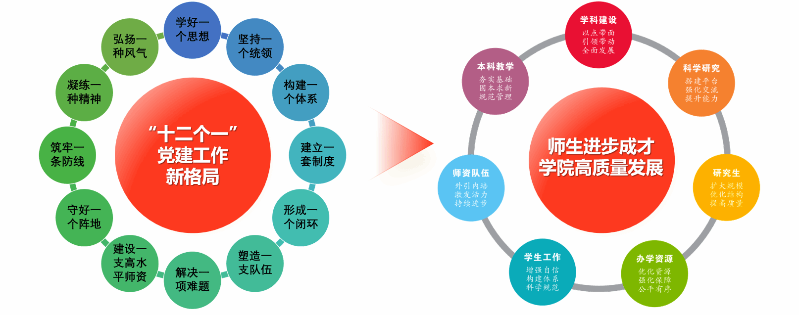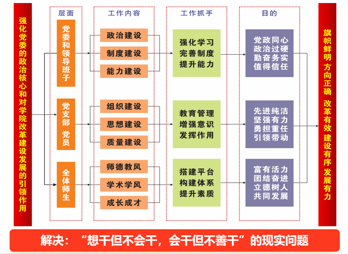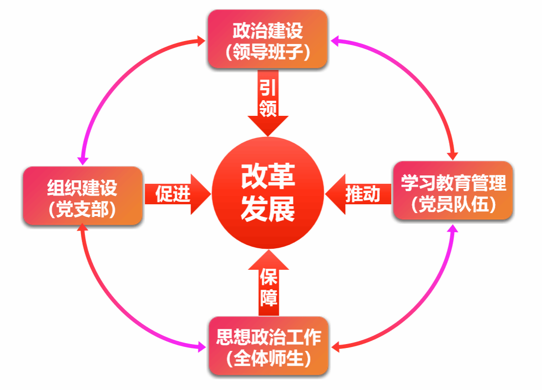 党建工作实施路径是以强化党委的政治核心和对91网站 改革建设发展的引领作用为出发点,以旗帜鲜明、方向正确、改革有效、建设有序、发展有力为落脚点,在领导班子、支部党员和全体师生三个层面推动党建工作。