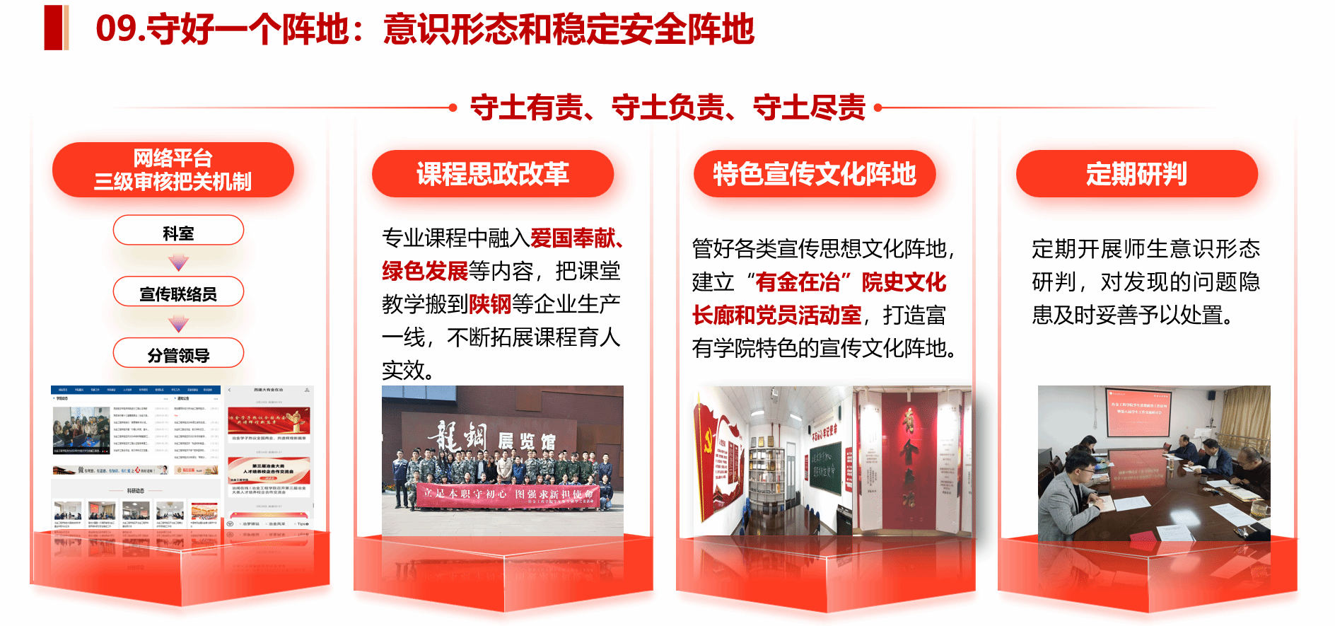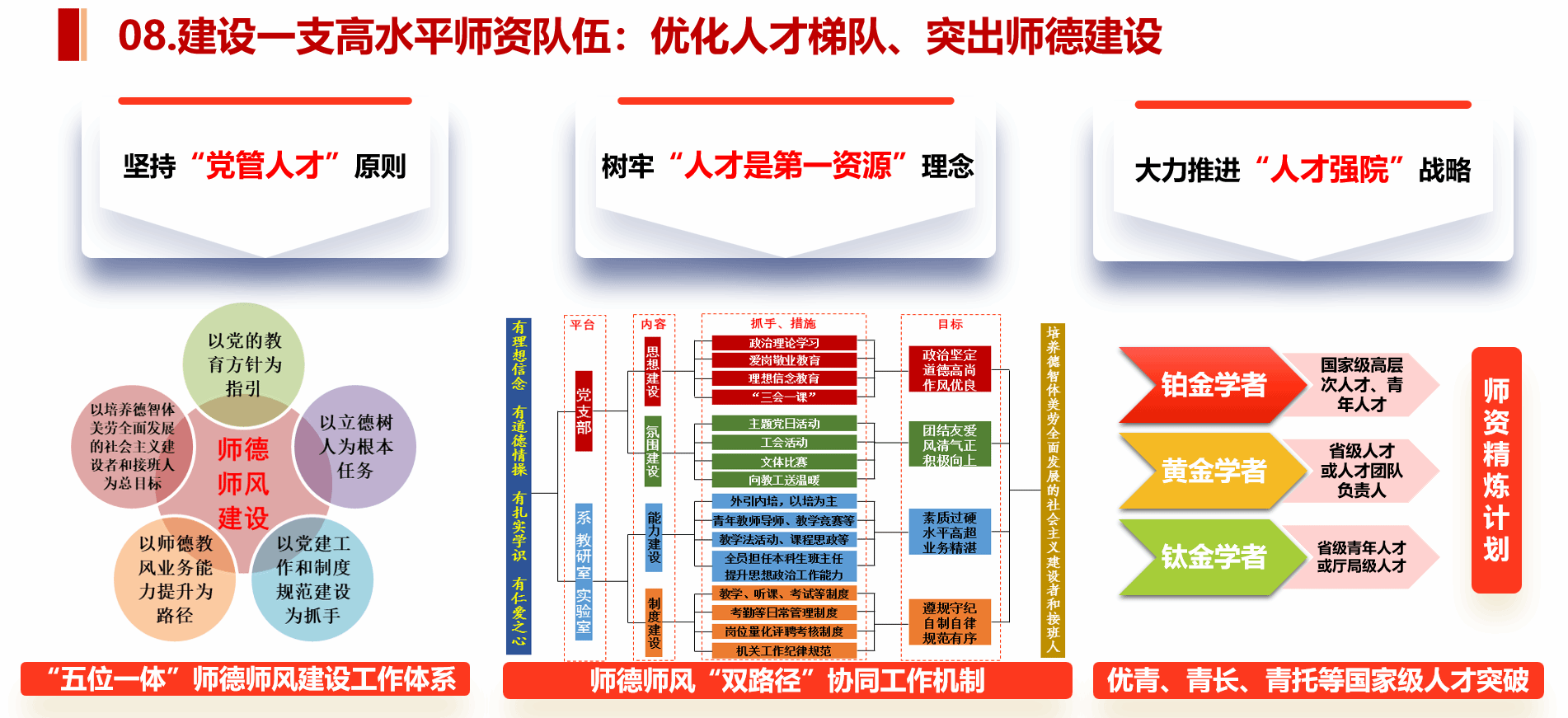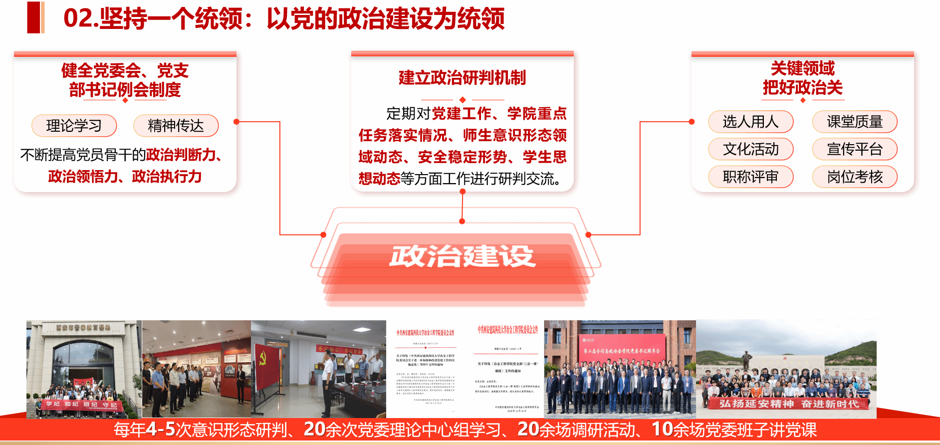党建工作实施路径是以强化党委的政治核心和对91网站 改革建设发展的引领作用为出发点,以旗帜鲜明、方向正确、改革有效、建设有序、发展有力为落脚点,在领导班子、支部党员和全体师生三个层面推动党建工作。