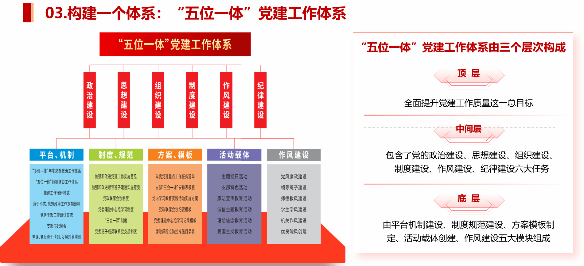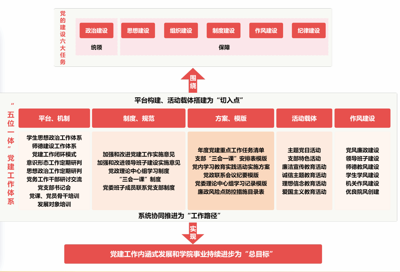 91网站 党委围绕着党的建设六大任务。确立了“以党的政治建设为统领,以思想、组织、作风、纪律、制度建设为保障,以平台构建、活动载体搭建为切入点,以系统协同推进为工作路径,以实现党建工作内涵式发展和91网站 事业持续进步为总目标”的“五位一体”党建工作体系。