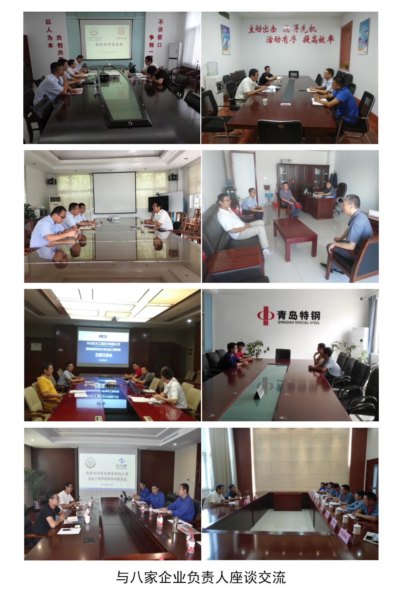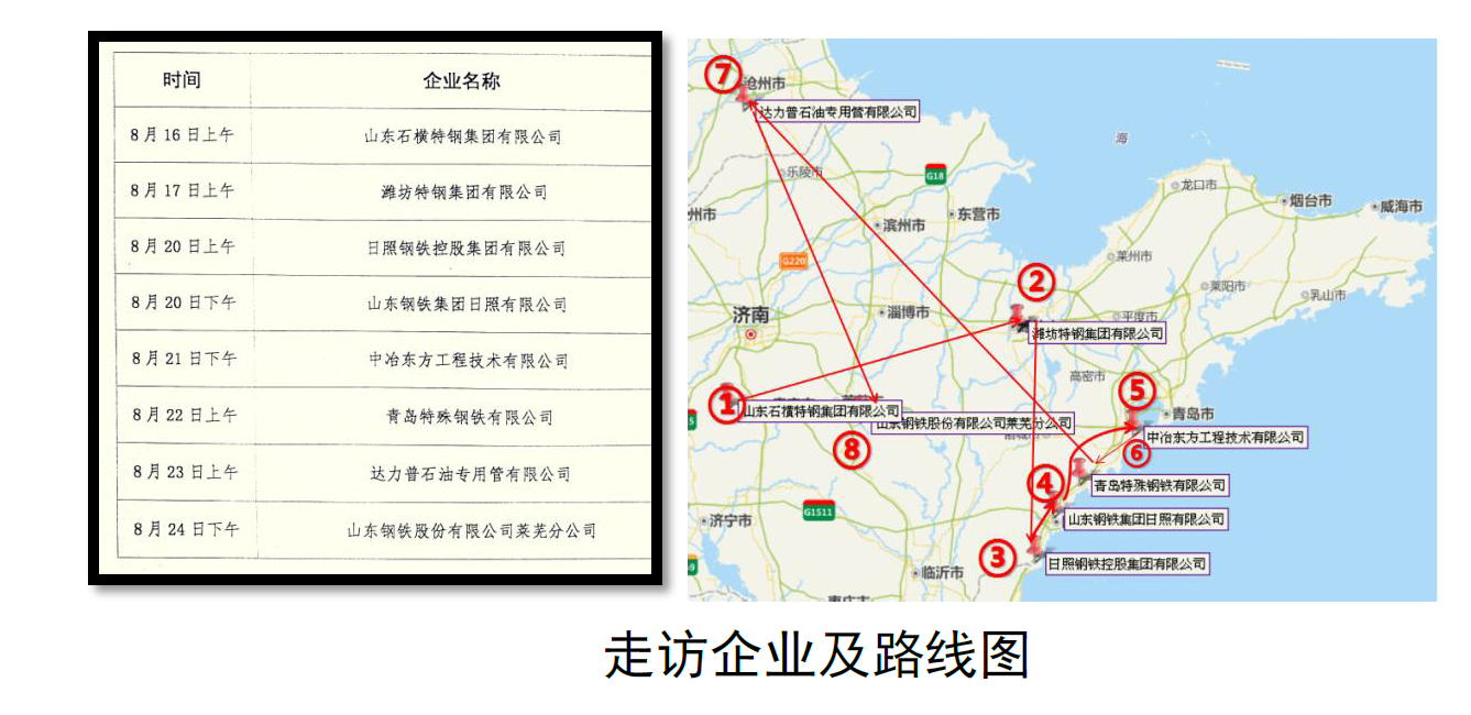 8月15日—24日,赵福才和罗帅两位老师先后走访了山东石横特钢集团有限公司、潍坊特钢集团有限公司、日照钢铁控股集团有限公司、山东钢铁集团日照有限公司、中冶东方工程技术有限公司、青岛特殊钢铁有限公司、达力普石油专用管有限公司和山东钢铁股份有限公司莱芜分公司八家知名冶金企业。