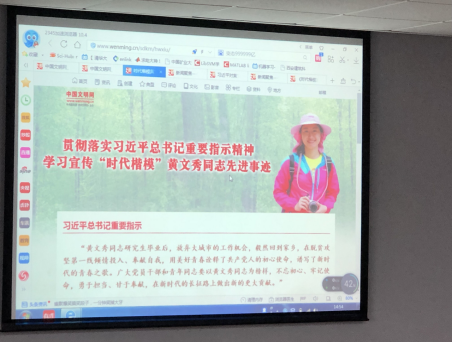 然后集体观看了《时代楷模发布厅》专题片。专题片回顾了黄文秀同志生前的工作生活,黄秀文同志是广西壮族自治区百色市委宣传部干部。2016年她从北京师范大学研究生毕业后,回到家乡百色工作。2018年3月,黄文秀同志积极响应组织号召,到乐业县百坭村担任驻村第一书记,埋头苦干,带领88户418名贫困群众脱贫,全村贫困发生率下降20%以上。2019年6月17日凌晨,她在从百色返回乐业途中遭遇山洪不幸遇难,献出了年仅30岁的宝贵生命。黄秀文同志在脱贫攻坚第一线倾情投入、奉献自我,用美好青春诠释了共产党人的初心使命,谱写了新时代的青春之歌,中共中央宣传部决定,追授黄秀文同志“时代楷模”称号。