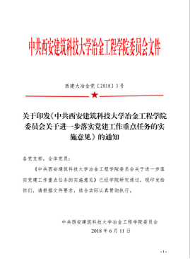 委员会关于进一步落实党建工作重点任务的实施意见》(西建大冶金党〔2018〕3号)文件,从加强领导班子建设、加强党支部和党员队伍建设、严肃党内政治生活、强化思想政治和意识形态工作、加强全面从严治党、夯实党建工作责任六个方面对《实施意见》进行了详细解读。随后,会议通报了校纪委转发的关于违反中央八项规定精神问题的10起案例,希望广大党员同志能够引以为戒,牢固树立规矩意识,强化纪律观念。
