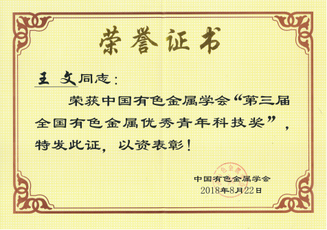 近日,在刚刚结束的第三届全国有色金属优秀青年科技奖评选中,学院青年教师王文脱颖而出荣获该奖项。全国有色金属优秀青年科技奖是中国有色金属学会设立并组织实施的,是面向全国有色行业广大青年科技工作者的奖项,旨在深入贯彻落实国家中长期人才发展规划纲要,努力造就千百万青年科技英才,激励、引导有色金属行业广大青年科技工作者为建设创新型国家、实现“中国梦”作出新贡献。该奖项每两年评选一次,每届获奖人数不超过20名,男性候选人年龄不超过39周岁,女性候选人年龄不超过44周岁。