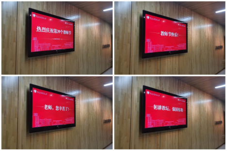 “为教师亮灯”公益活动。教师节前夕,在工科大楼11楼电梯间通过电子屏幕为教师“亮灯”,滚动显示“老师,您好!”“老师,您辛苦了”“教师节快乐!”“躬耕教坛,强国有我”等字幕,引导学生感念师恩、礼敬教师,与全院教师共度节日。