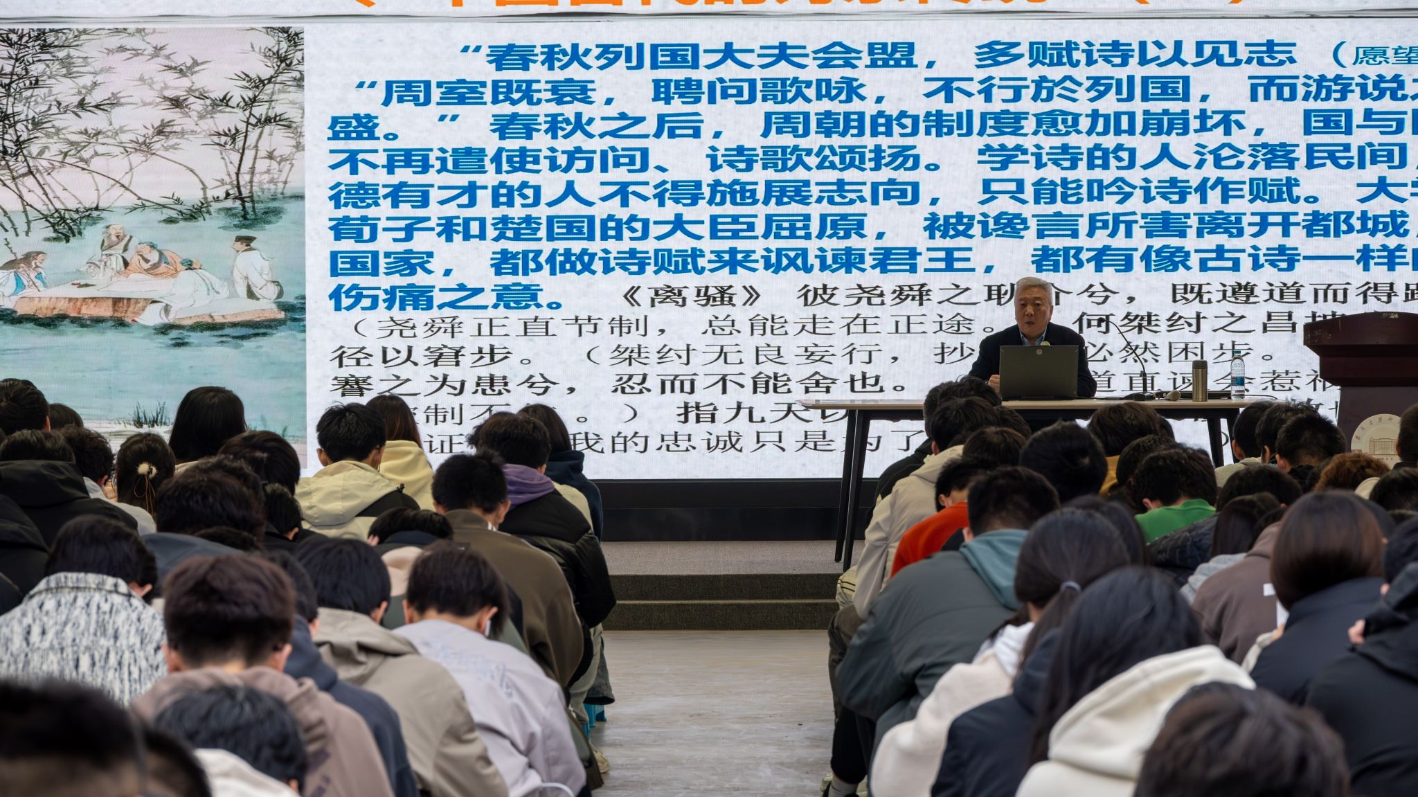 讲座围绕中国古代诗教与吟诵的内涵展开,分享了中华吟诵的基本原则以及个人的吟诵主张,并辅以吟诵技巧和精彩示例。诗歌作为人类情感的重要表达方式,不仅展现了作者内心世界,还承载着丰富的历史文化信息,核心价值体现在“诗言志”,寄托着作者的志向与情感。