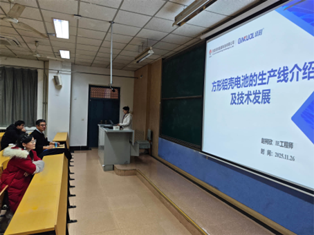 1126日,陕西顷刻能源科技有限公司的IE工程师赵柯欣受邀为新能源器件与材料2022级学生讲授了锂离子电池的核心构造与组成,并以“极片制作-电芯制作-电芯装配-电芯检测-注液化成”为主线,拆解了某常见类型电池的制浆、涂布、辊分、模分、卷绕、注液等关键工艺环节。