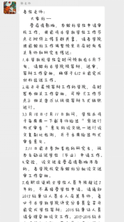 杜忠泽老师通过微信语音会议的形式组织毕业论文讨论,是杜忠泽老师课题组的假期常态,每一位同学就自己的完成进度以及内容进行报告,大家围绕报告内容进行深入讨论,并提出完善意见,推进进度。王伟老师在假期给同学们布置了学术任务,并通过微信给予了大家远程指导。在此期间,他也一直在师门群里鼓励大家利用假期时间学习、休息,在疫情防控期间保重身体。