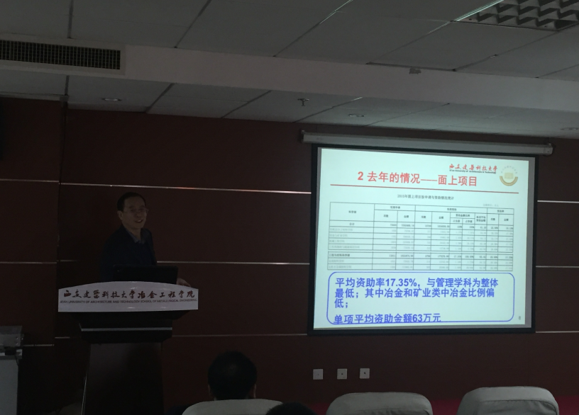冶金工程学科学术带头人赵俊学教授,报告题目为“国家自然科学基金申请书撰写的几点体会”。报告会上,赵教授通过自己在近几年申报国基金中的经历,与大家分享怎样撰写一本高质量的国基金申请书。并从申请人的角度以及国基金评审专家的角度分别阐述了如何更有效的提高国基金的命中率。