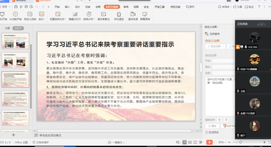 然后,由张仕威带领学习习近平总书记来陕考察重要讲话、重要指示,主要包括:1、扎实做好“六稳”工作、落实“六保”任务;2、我国经济稳中向好、长期向好的基本趋势没有改变;3、要围绕推进国家治理体系和治理能力现代化,突出基础性、根本性、全局性的重大改革举措,打造内陆改革开放高地;4、陕西生态环境保护,不仅关系自身发展质量和可持续发展,而且关系全国生态环境大局;5、民生是人民幸福之基、社会和谐之本;6、延安精神培育了一代代中国共产党人,是我们党的宝贵精神财富;7、陕西是中华民族和华夏文明重要发祥地之一。
