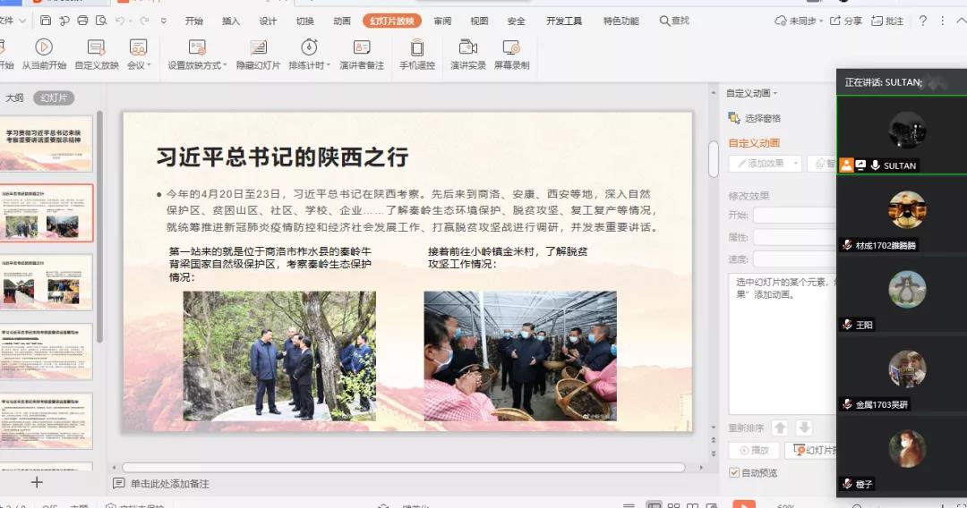 首先,张仕威同学在腾讯会议上为大家展示了此次习近平总书记来陕考察的路线。于商洛市柞水县的秦岭牛背梁国家自然级保护区了解秦岭生态保护情况;于小岭镇金米村了解脱贫攻坚工作情况;于安康市的平利县锦屏社区等地考察当地脱贫攻坚等情况;最后于西安的陕西汽车控股集团有限公司、西安交通大学、大唐不夜城步行街,了解企业复工复产和社会生活秩序恢复等情况。路线涉及生态环境、脱贫攻坚、复工复产三大主题,这也是当前民众最关心的问题,习近平总书记深入基层全面掌握一线信息,如此“接地气”,必当激发起广大干部群众的干劲,稳步推进新冠肺炎疫情防控和经济社会发展工作、打赢脱贫攻坚战!