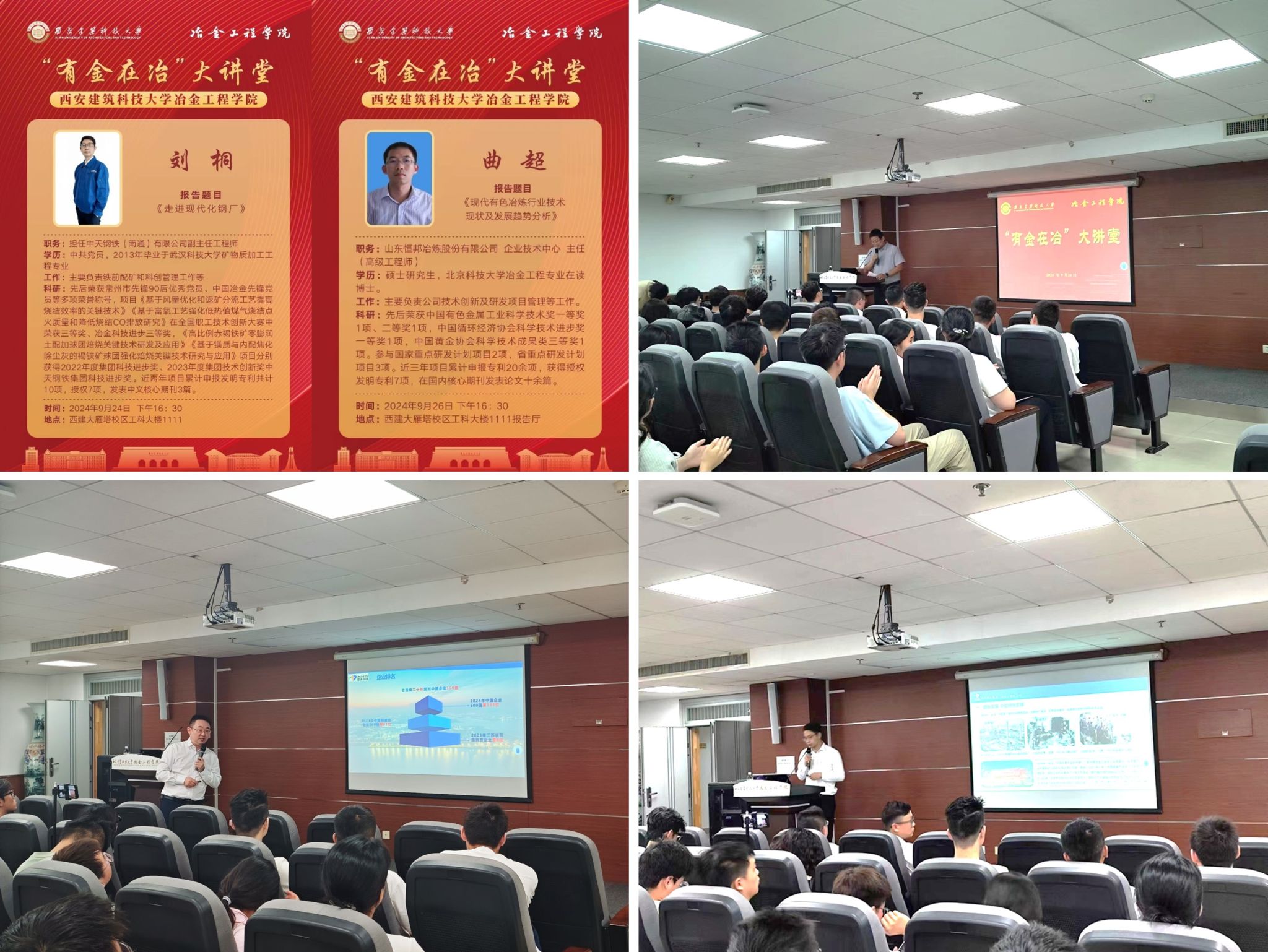 推行“有金在冶”大讲堂,充分了解行业前景。9月24日、26日,日照钢铁、中天钢铁、山东恒邦等企业来校,采用线上直播和线下结合方式,为全院师生分别作了题为《ESP薄板坯连铸连轧原理及工艺》、《走进现代化钢厂》和《现代有色冶炼行业技术现状及发展趋势分析》报告。他们分别从现代化钢厂和有色冶炼行业建设情况、技术现状及行业发展趋势等多个方面讲解了现代化钢铁企业建设情况,强化学生专业自信的同时帮助毕业年级学生更深层次了解行业未来发展趋势,增强了同学们行业内就业的自信心。