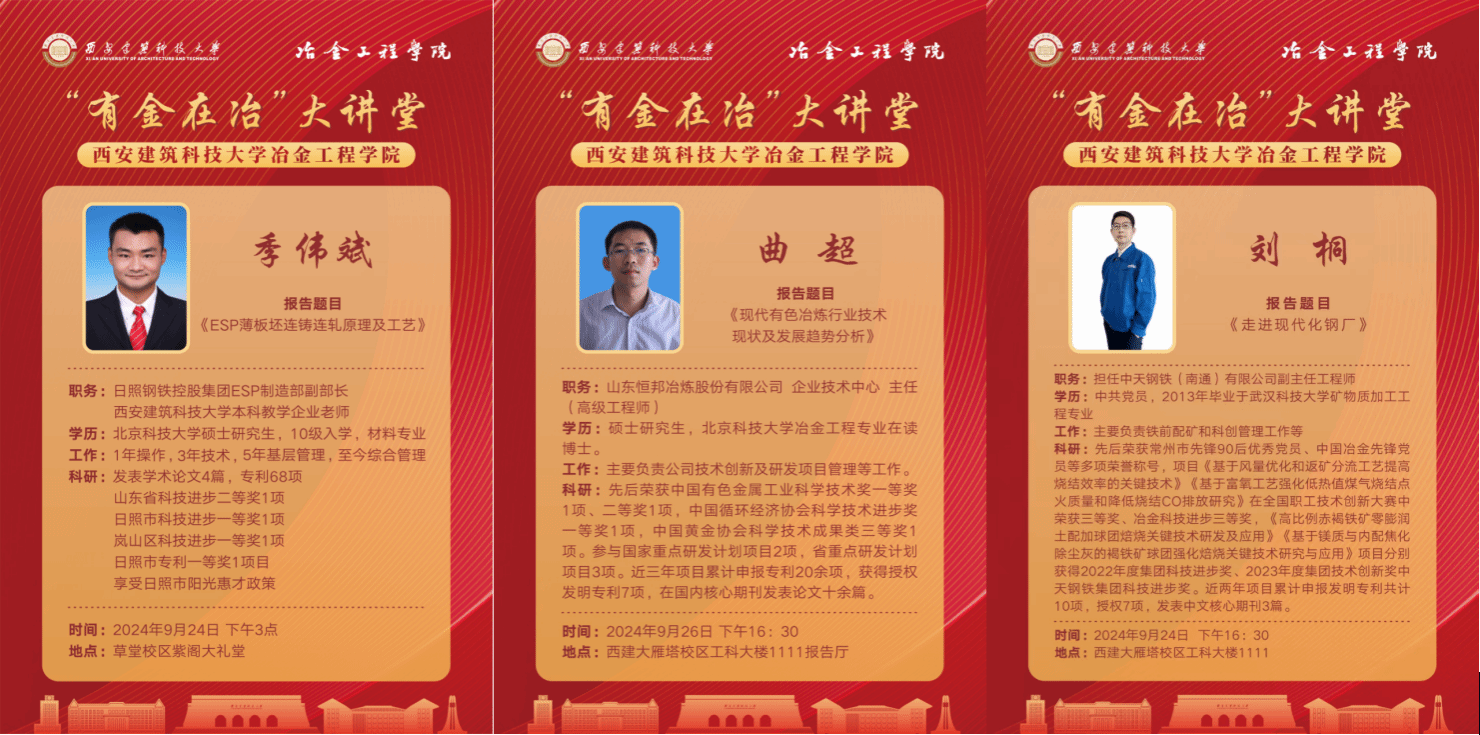9月26日16:30,第四期“有金在冶”大讲堂在雁塔校区工科大楼1111报告厅举行,学院邀请山东恒邦冶炼股份有限公司企业技术中心主任(高级工程师)曲超做《现代有色冶炼行业技术现状及发展趋势分析》为题的汇报活动,曲超从公司简介、行业现状、行业未来发展方向三个方面进行介绍,提高了学生对专业的认知,增强了对行业未来趋势的了解,同时帮助学生明确自身发展目标。
