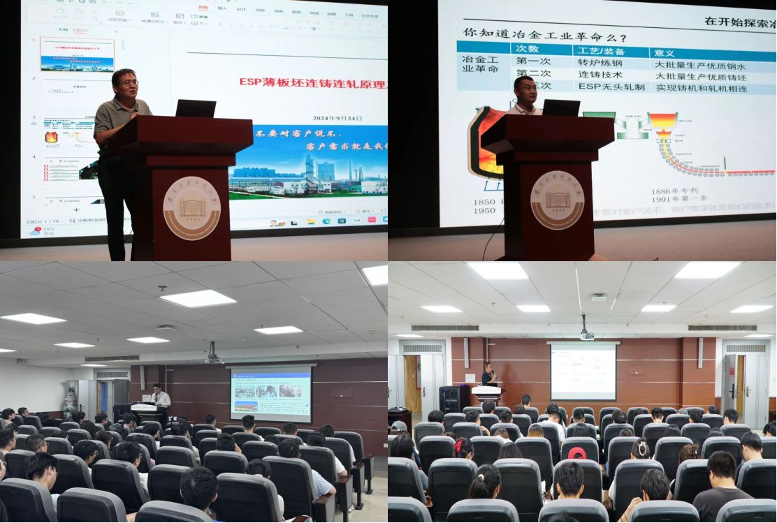 9月24日16:30,第三期“有金在冶”大讲堂在雁塔校区工科大楼1111报告厅举行,学院邀请中天钢铁(南通)有限公司副主任工程师刘桐做《走进现代化钢厂》为题的报告,刘桐详细介绍了 公司推动制造业高端化、智能化、绿色化发展的成果和未来现代化钢厂的发展方向,帮助学生对就业方向、素质培养等方面有了更深刻的理解和感悟。