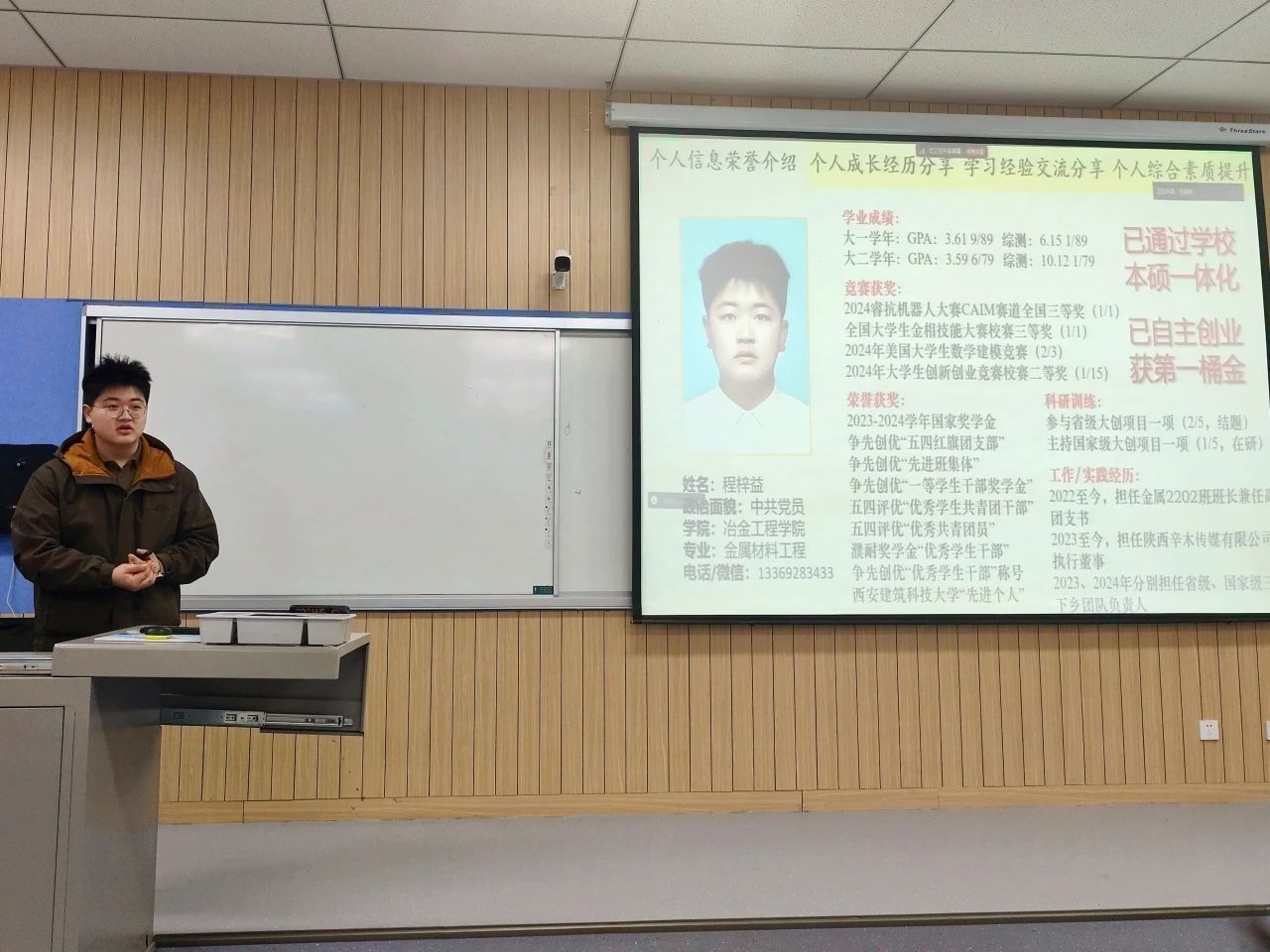 程梓益简要介绍了自己所获得的各项个人荣誉,然后重点分享了他在学习过程中积累的经验以及提升个人综合素质的方法。他结合自身实际情况,深入探讨了高效学习的方法与策略,以及如何在学术研究中应对挑战与困难,为在场的同学们提供了实用的参考与指导。